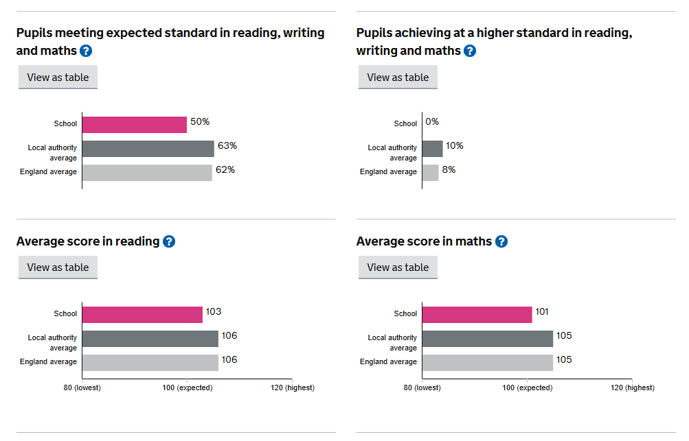 Below are two tables which show average scaled scores for Reading and Mathematics for pupils at the End of Key Stage 2 for the academic year 2024-25:
