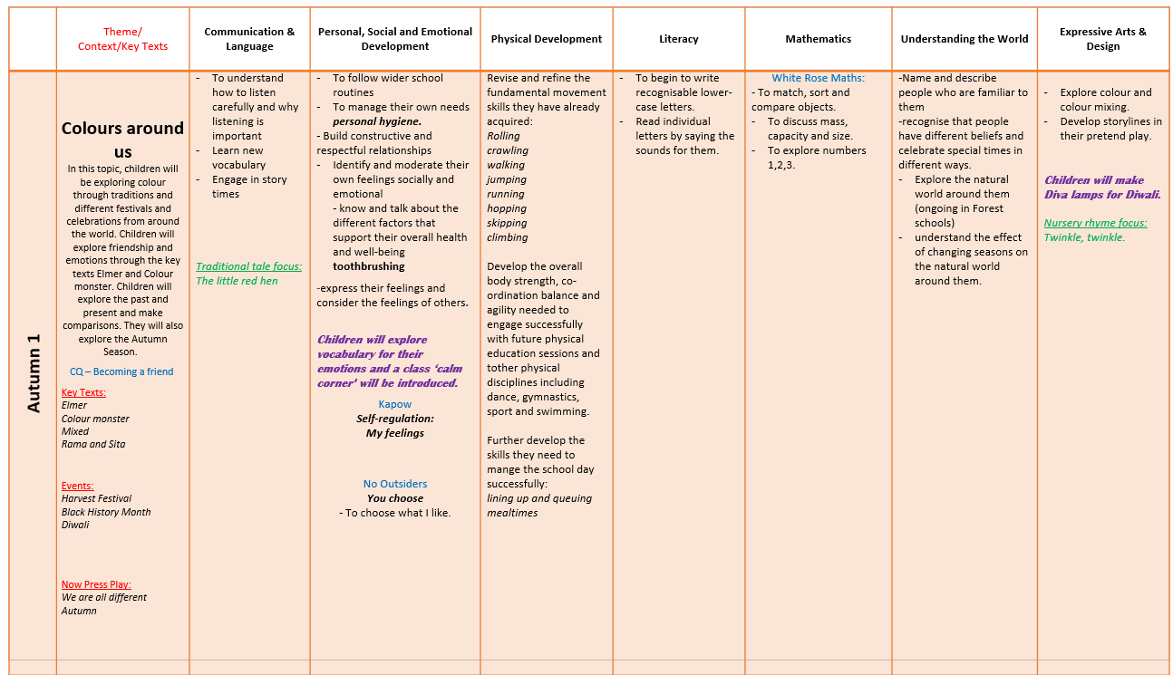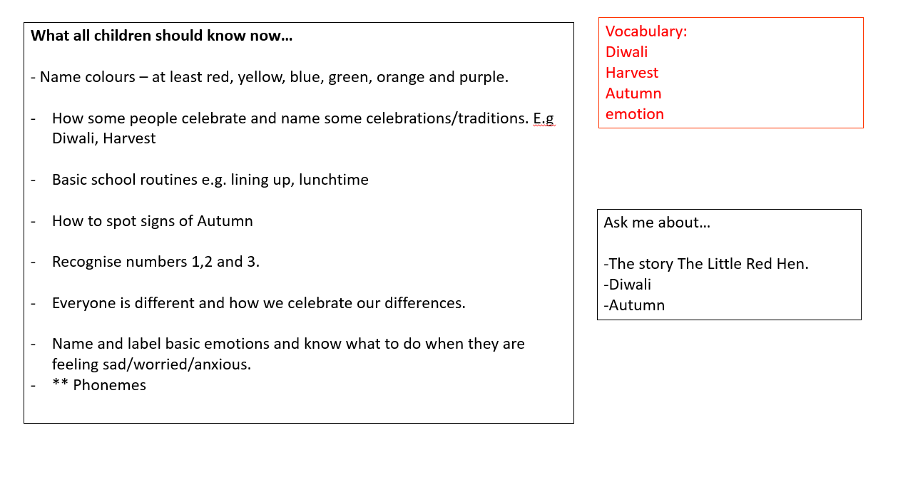 Across the year, children explore rich themes—from celebrations, community and seasonal change, to lifecycles, habitats, helping roles and global awareness. Each topic is designed to broaden vocabulary, strengthen understanding and deepen curiosity. Daily opportunities for high‑quality interaction, purposeful play and direct teaching ensure that all children access the full curriculum and develop confidence, independence, resilience and a sense of belonging. Research underscores the value of clear, focused early curricula that emphasise essential content and avoid overloading young learners, which is why every element of our offer is planned with intention and clarity.