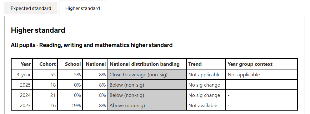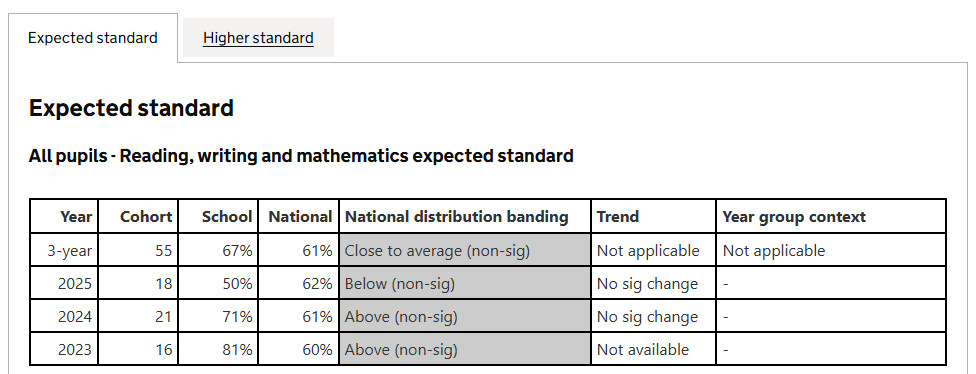 Below are two tables containing our 3-year data for pupils at the End of Key Stage 2. The first table shows the percentage of pupils who achieved the expected standard in Reading, Writing and Mathematics; the second table shows the percentage of pupils who achieved the Higher Standard in Reading, Writing and Mathematics.
